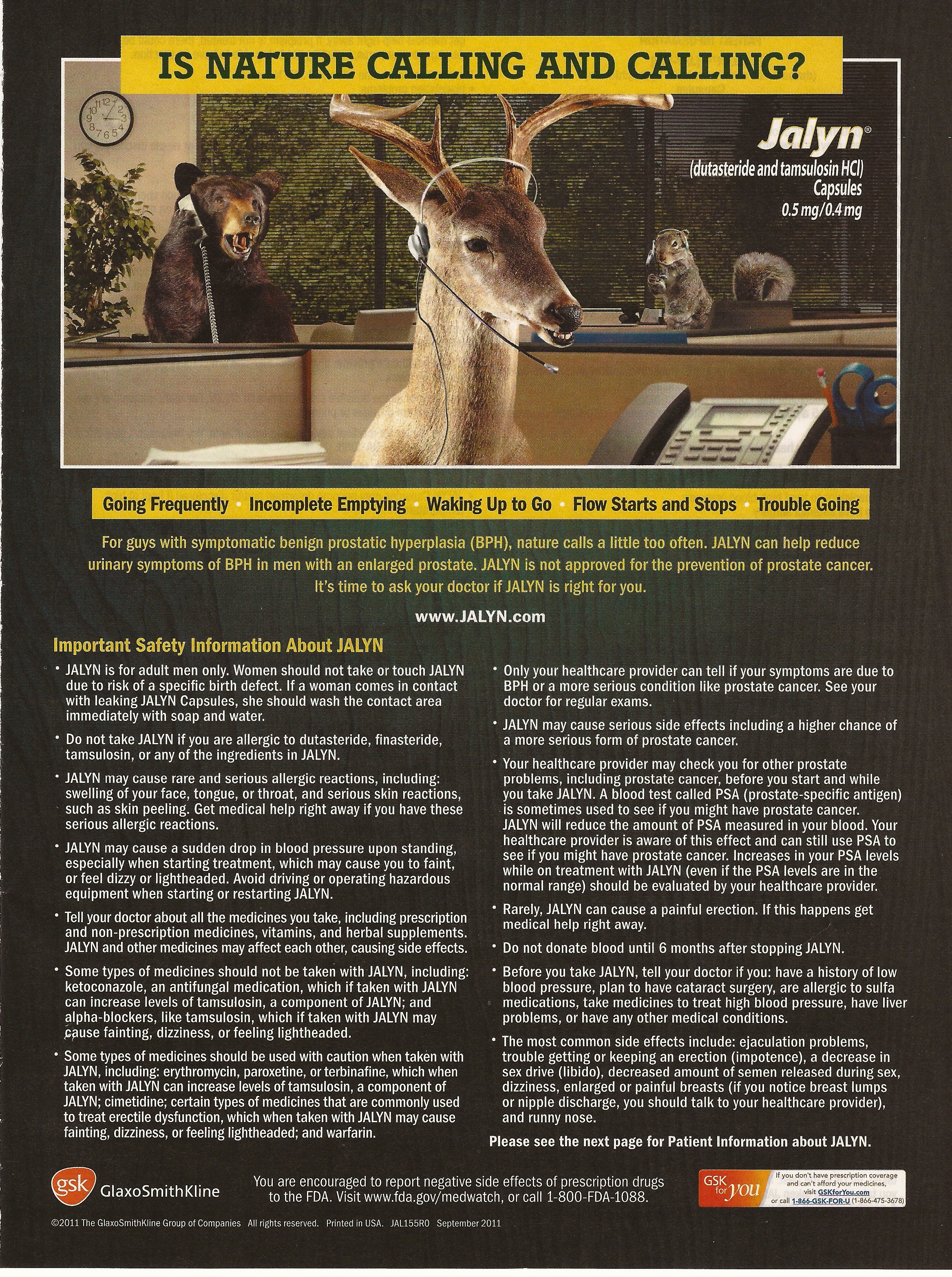 (Editor’s Note: Among the 14 bullets of warnings, the one at bottom right says the most common side effects include: “ejaculation problems, trouble getting or keeping an erection (impotence), a decrease in sex drive (libido), decreased amount of semen released during sex, dizziness, enlarged or painful breasts (if you notice breast lumps or nipple discharge, you should talk to your healthcare provider), and runny nose.”)
