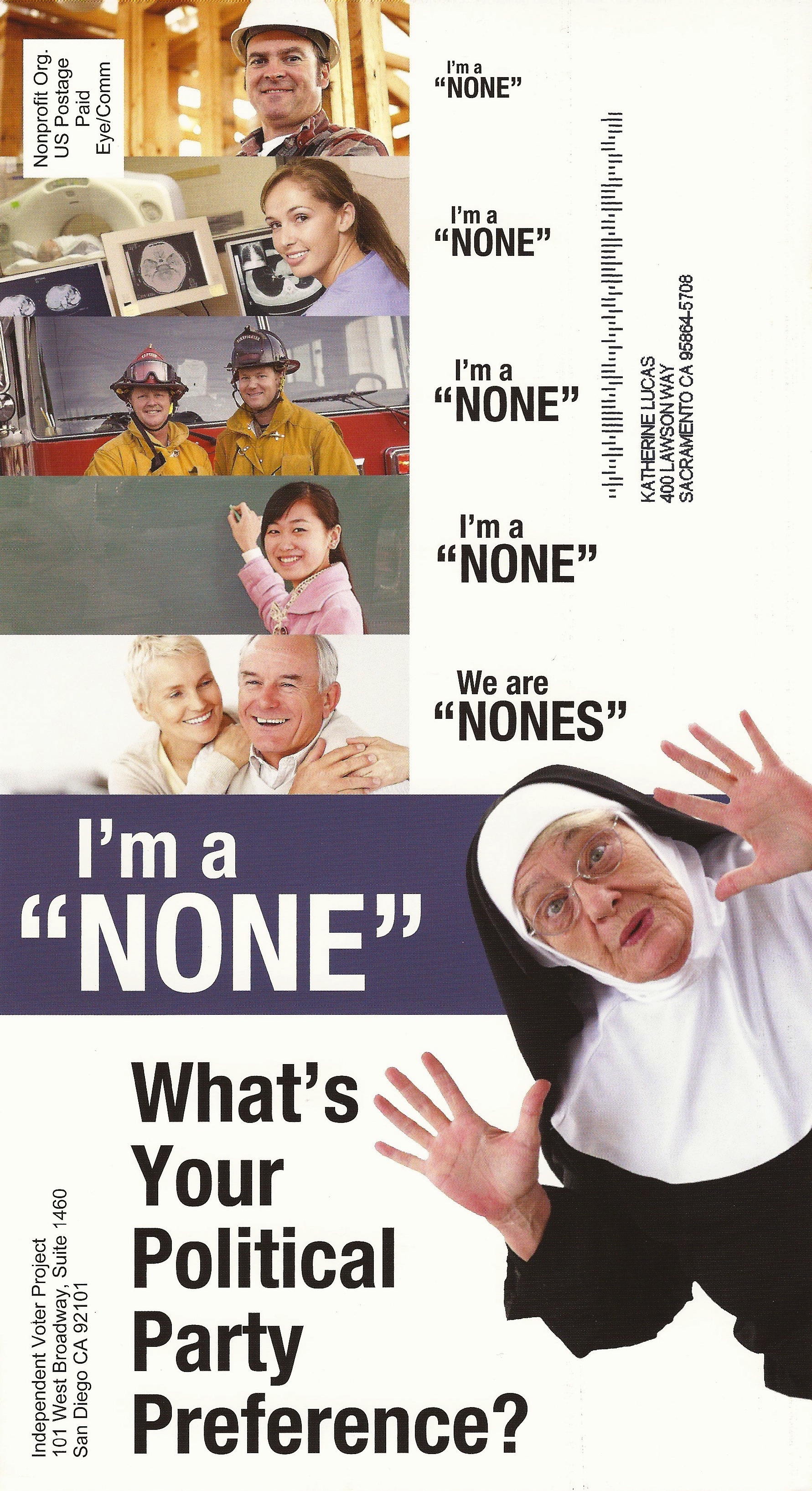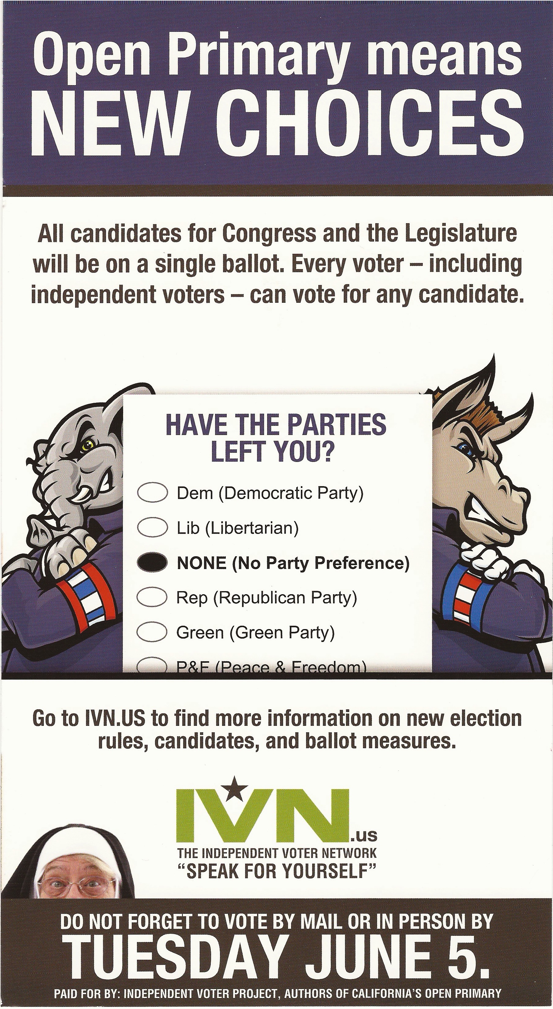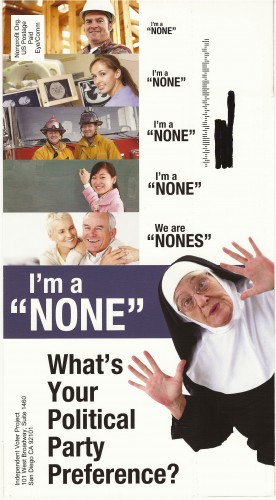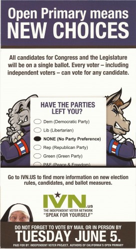 The Independent Voter Network, the backer of Proposition 14, the so-called “open primary law,’ which goes into effect on the June 5 primary, has sent this mailer to voters who don’t state a party preference.