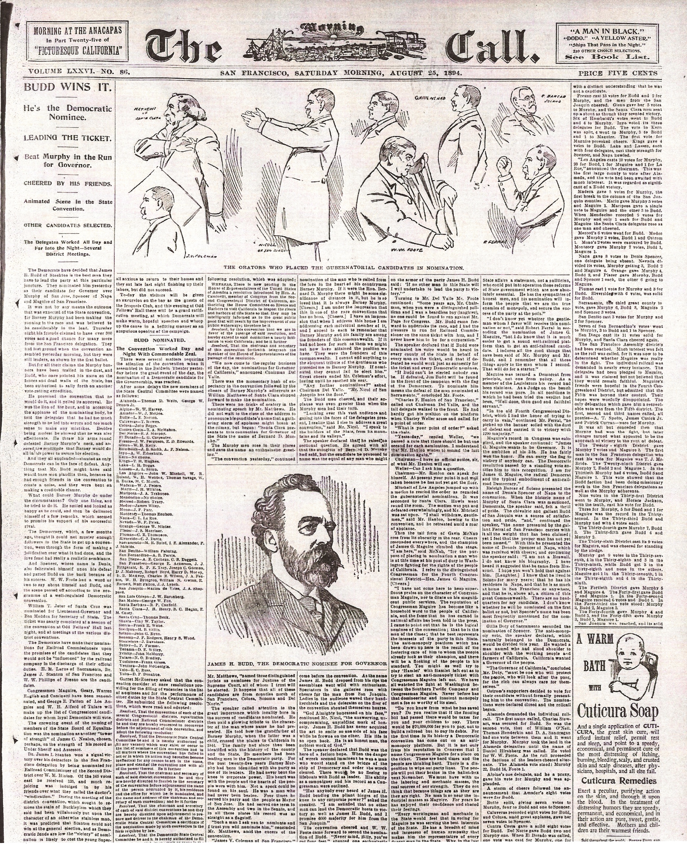 But when the Democrats held their 1894 convention at the Baldwin Theater in San Francisco, Budd was one of the four candidates being considered for governor.