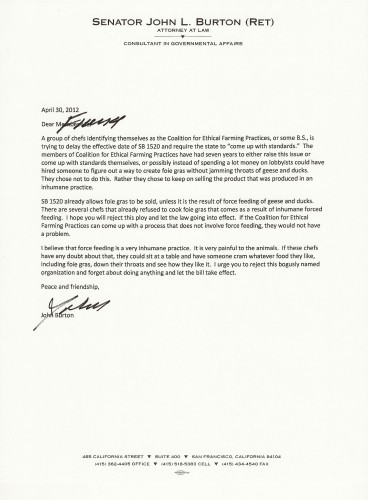 In 2004, a bill by Burton — SB 1520 — was signed into law which said that, effective July 1, 2012, it was illegal for birds including, but not limited to, a duck or goose to be forced to “consume more food than a typical bird of the same species would consume voluntarily” in order to enlarge their liver “beyond normal size.”