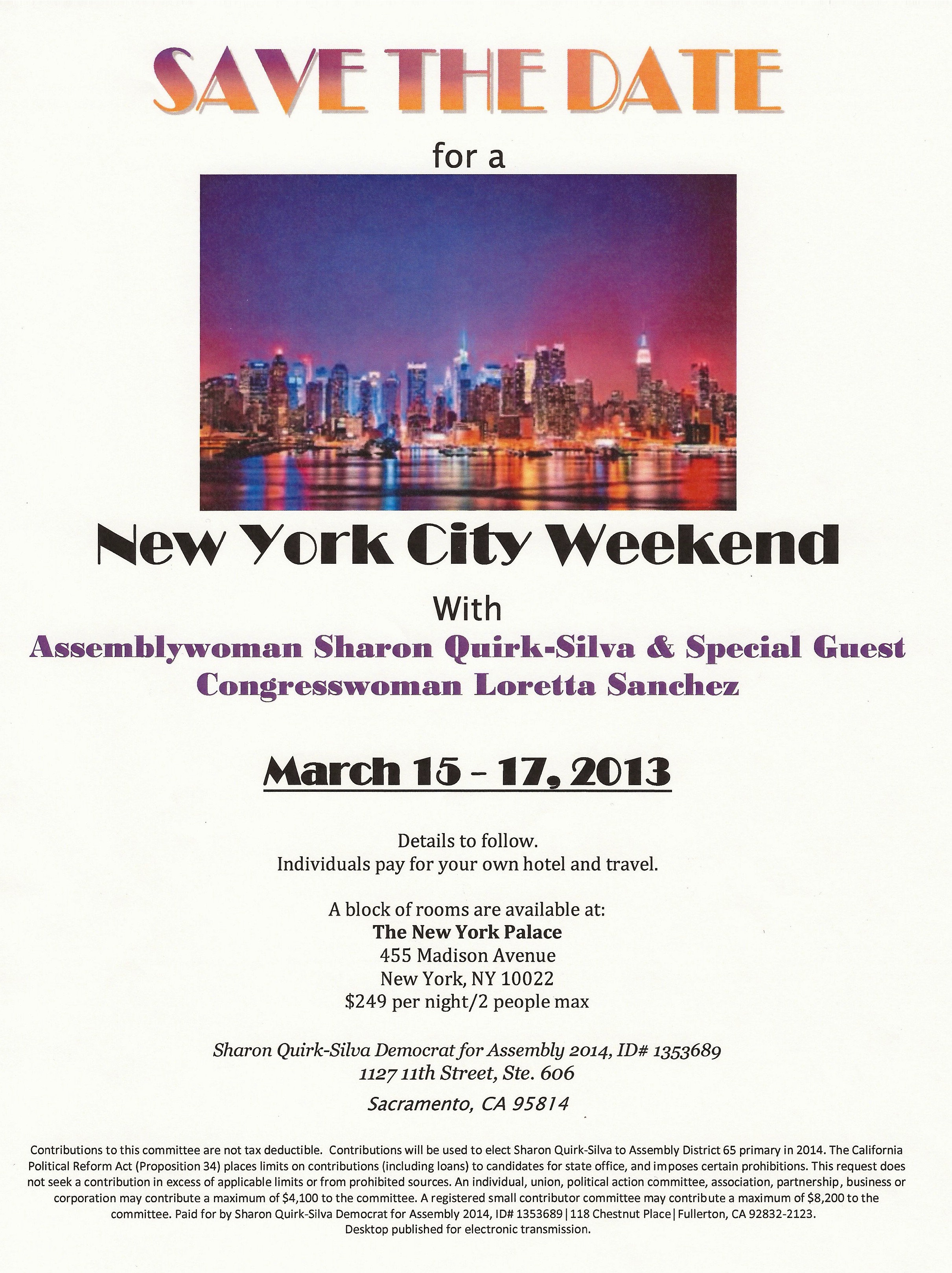 Although the airfare might be getting a bit dear with just 72 hours until flight time, there’s still space to spend a long weekend with Assemblywoman Sharon Quirk-Silva, a Fullerton Democrat, and her guest Congresswoman Loretta Sanchez, also an Orange County Democrat. The $249 per room rate for two nights at The Palace is a pretty good deal.