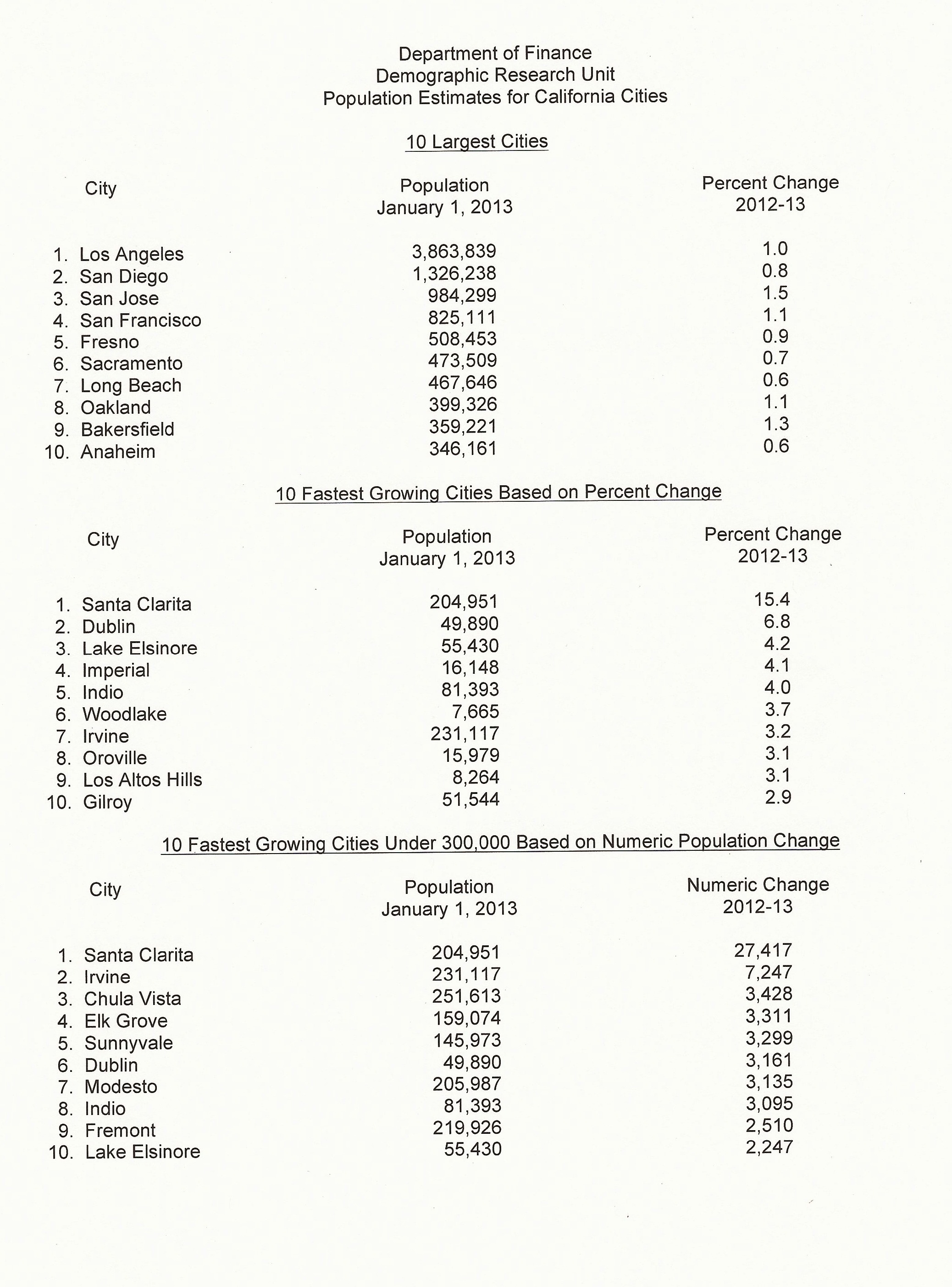 The report shows preliminary January 2013, as well as revised January 2012, population data for cities. Highlights include: